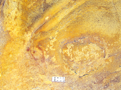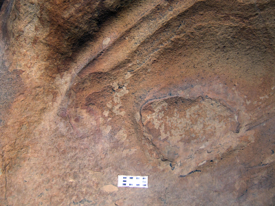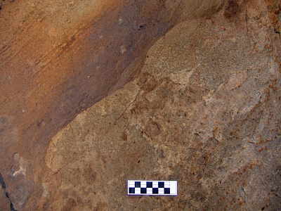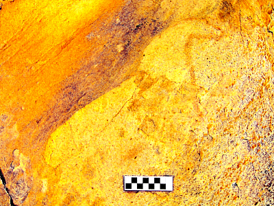 Équido No. 2: Esta figura se halla en un estado de conservación mucho peor que la figura anterior. Se puede observar la cabeza mirando hacia la izquierda abajo. También este équido muestra el rasgo estilístico "Pico de Pato" y está realizado junto a unos resaltes naturales. A causa de desconchones se ha perdido parte del morro. |