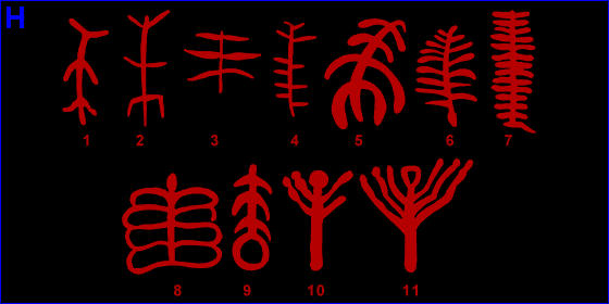 La Línea del Ciervo hace referencia a la distribución geográfica de ciertos signos postpaleolíticos y separa las sierras de la costa atlántica de las del interior. Mientras en las sierras de la costa (Sierra de Enmedio, Sierra de Fates, Sierra de Salaviciosa, Sierra de San Bartolomé, Sierra de la Plata y Sierra de Retín) no existen por ejemplo representaciones postpaleolíticas de ciervos, otros signos de este territorio no se encuentran en las sierras del interior. Este hecho puede tener varias causas y es objeto todavía de estudios (Ver también : Escenas de caza y animales heridos.).b La obra "Rock Paintings of Southern Andalusia. A description of a Neolithic and Copper Age Art Group" de H. Breuil y M. C. Burkitt (ver bibliografía) hace referencia al posible desarrollo de signos a partir de otros más antiguos cuyo significado quedó en olvido. A continuación incluimos un resumen de este trabajo (Note by the translater) : Serie A : Aquí se puede seguir fácilmente la derivación del símbolo (11), que se asemeja a una letra "Phi griega" ( f i ), desde un simple dibujo de la figura humana (1) . Serie B :p En esta serie es dudoso si la primera figura (1) representa a una sola persona o a una pareja. La disposición simétrica de estas figuras de la Cueva de Bacinete-5 significa una característica excepcional en el arte rupestre de la región. Serie C : La extensión horizontal de los brazos y las piernas conduce a un signo en forma de "H" (4), girada 90 grados. La omisión de las piernas da como resultado una cruz (6, 7,8). Serie D : La intención de esta serie es mostrar la posible derivación de algunos signos en forma de estrella o sol. Es posible que figuras como las tres primeras originaron "estrellas" de cinco rayos como la figura Nº 4, y esta a su vez a otras con más rayos cuando su significado original se había olvidado en el transcurso del tiempo. Las figuras 9 a 12 hacen referencia a un origen humano de estrellas de seis rayos. Sería ir demasiado lejos asumir un origen humano para los signos 6, 7 y 8 que se asemejan a flores. Es posible que estos símbolos de centro hueco representen cabañas redondas. Poco probable es la interpretación de Cabré y Pacheco que ven en ellos la representación de nidos. Serie E : En la serie E se aprecia la posible simplificación del símbolo del hombre. Serie F : La peculiar forma de cabeza de estas figuras representa posiblemente algún tipo de peinado, tocado o casco. La figura Nº 1 destaca por la representación no muy frecuente de un escudo y algún arma punzante. Serie G : La línea zigzag puede ser una derivación de las piernas dobladas de una persona. La figura abajo (5) representa posiblemente una exageración de este símbolo. Serie H : La serie H muestra la posible transición de antropomorfos a ramiformes verticales. El número de extremidades aumenta y se pierde cualquier parecido con la figura humana. Varios signos de este tipo pueden tener su origen también en la representación de algún vegetal (6). Las figuras 9, 10 y 11 muestran posibles caracteres femeninos. La multiplicación de brazos puede significar algún poder sobrenatural. Serie I : En esta serie se observan representaciones femeninas. Por regla general tienen los brazos levantados. Los típicos signos bitriangulares (9 y 10) en forma de reloj de arena se comparan con otro (11) más naturalista con un peinado muy elaborado. Serie K : a La serie K representa algunos animales. Se aprecia una variación del número de las extremidades y la transición a los símbolos pectiniformes (Del lat. pecten, -inis, peine, y de forma). El último signo (15) se asemeja a la letra "Pi griega". (*) El pésimo estado de
