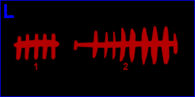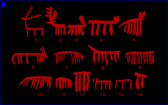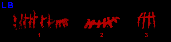 tratamiento de imágenes por ordenador.) Serie L : Estos signos "barrera" (ramiformes horizontales) se diferencian de los de la serie anterior : las líneas verticales cruzan la línea horizontal. Para H. Breuil no hacen referencia a animales, sino a posibles estructuras de madera.