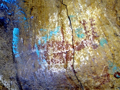 de la Chinchilla-2: (Jimena de la Frontera) Arte rupestre dañado con pintura de color azul verdoso. |